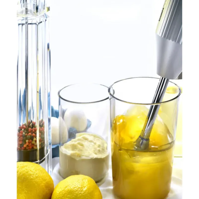 Le Bamix Black Edition est fourni avec des accessoires exclusifs qui vous permettent de combler toutes vos envies culinaires. 4 disques différents à adapter en fonction de vos besoins, un processeur de 250 ml, et deux gobelets dont un avec un bec verseur qui vous permettent de contenir vos préparations et de les transvaser facilement. Le cordon d’alimentation qui relie le mixeur à son support est torsadé, pour ne pas risquer qu’il s’enraye dans le disque du mixeur, ou encore qu’il ne traîne sur votre plan de travail. En plus d’être puissant, le Bamix M250 est silencieux pour cuisiner sans bruit et sans effort, et reste étanche jusqu’au dessus des boutons poussoirs.
