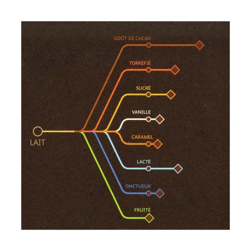 Ce chocolat au lait peu sucré au goût puissant de cacao et de lait s’accordera parfaitement avec : Mangue, Fruit de la Passion, Whisky, Miel, Caramel, Noisettes, Fleur de Sel, Framboise, Café instantané Nescafé Espresso.