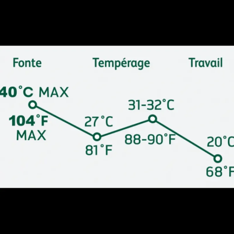 - À manipuler avec précaution notamment lors de la fonte ou du tempérage (40°C maximum)