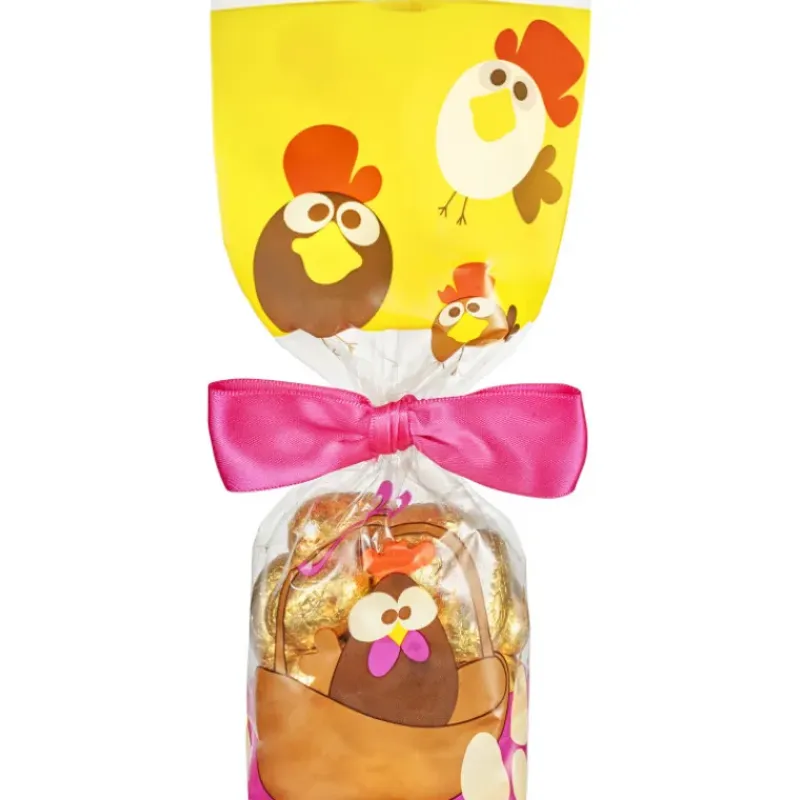 Le sachet avec fond Cocotte arbore de part et d’autres de jolies poulettes de Pâques. A moitié transparent, le sachet avec fond cocotte laisse deviner son contenu, pour mettre l’eau à la bouche ! Grâce au fond en carton doré, le sachet se tient immobile et droit. De cette manière, vous pourrez le remplir facilement et rapidement, et gagner en espace de rangement en cas de transport.