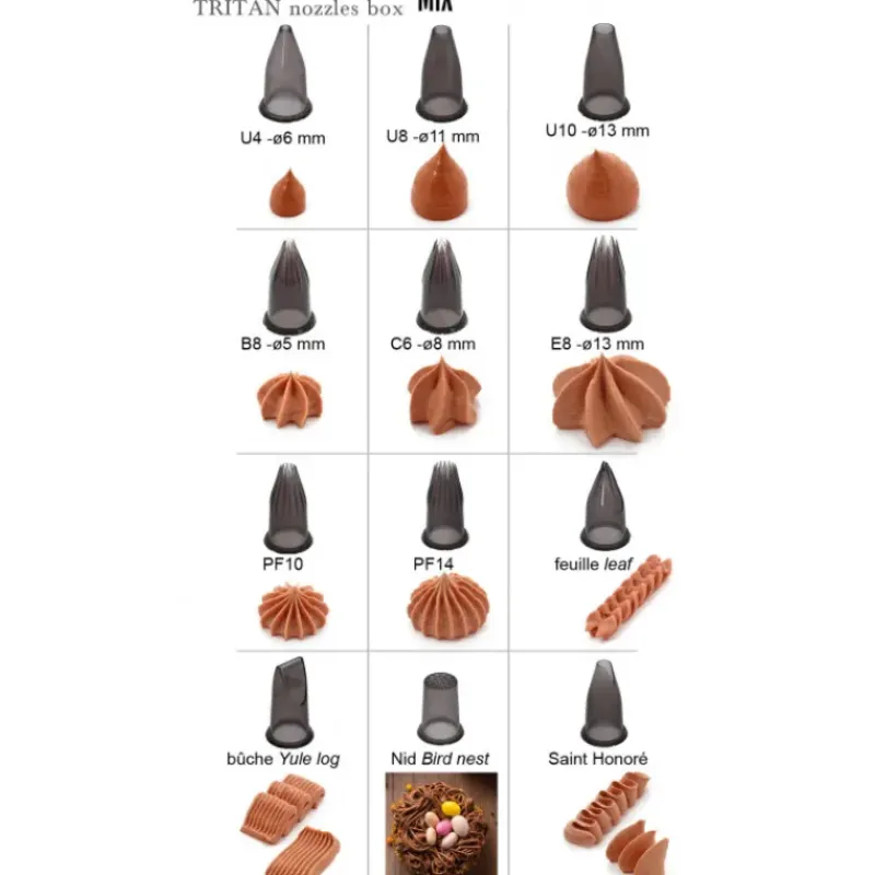 Faites le plein de Douilles à Pâtisserie avec cet Assortiment de 12 Douilles De Buyer. Vous retrouverez dans ce lot des Douilles en Tritan qui vous permettront de décorer, pocher ou encore fourrer toutes vos préparations. Douilles Cannelées, Douilles Unies, Douilles Feuilles… tant de formes différentes qui vous donneront de nouvelles idées pour sublimer toutes vos recettes.