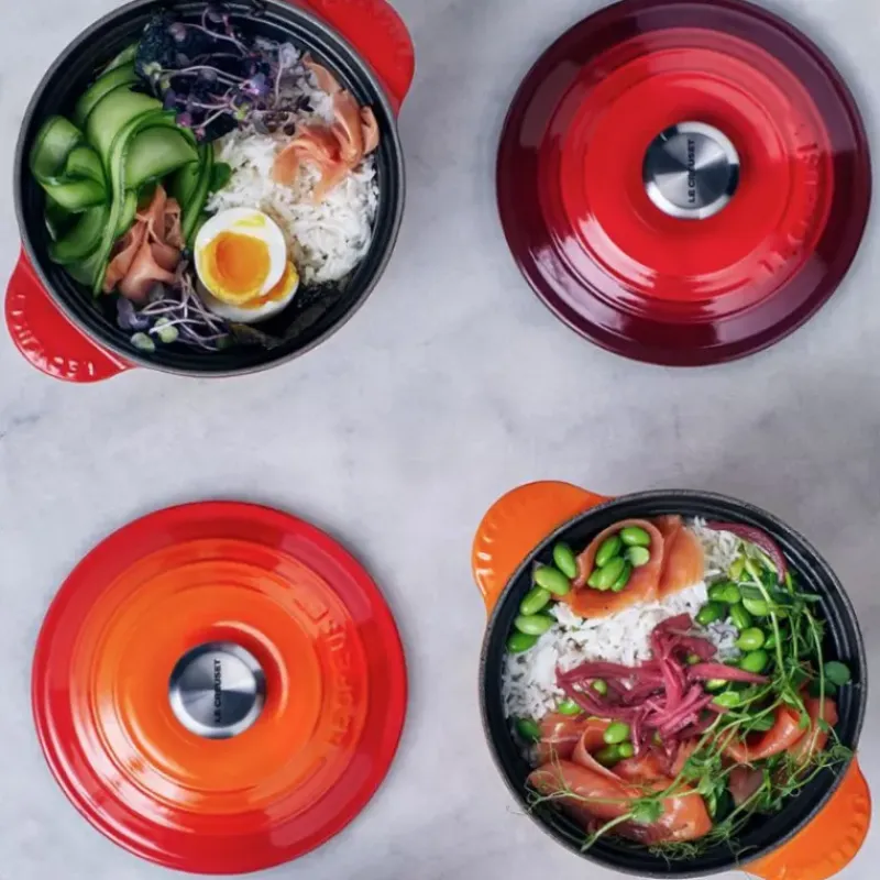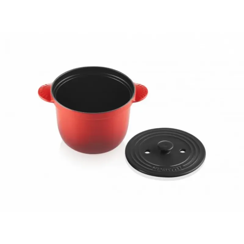 La cocotte en fonte Every Le Creuset est robuste (garantie à vie) son intérieur en émail noir mat vous assure résistance dans le temps et aux rayures. La cocotte haute rouge cerise est munie de deux couvercles : un couvercle bombé en fonte et un couvercle intérieur anti-débordement en céramique. Ce dernier est muni de deux perforations assurant ainsi l’évacuation de la vapeur et la bonne hydratation lors de la cuisson pour des aliments savoureux et tendres.
