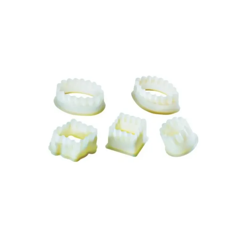 Le set comporte 5 emporte pièce Géométriques Cannelés : un rond, un carré, un losange, un ovale pointu et un ovale arrondi. En une pression, pâtissiers professionnels et amateurs pourront donner une forme originale à leurs biscuits et autres gâteaux individuels. Les emporte pièce sont constitués d’un seul bloc, afin de répondre aux normes d’hygiène alimentaire.
