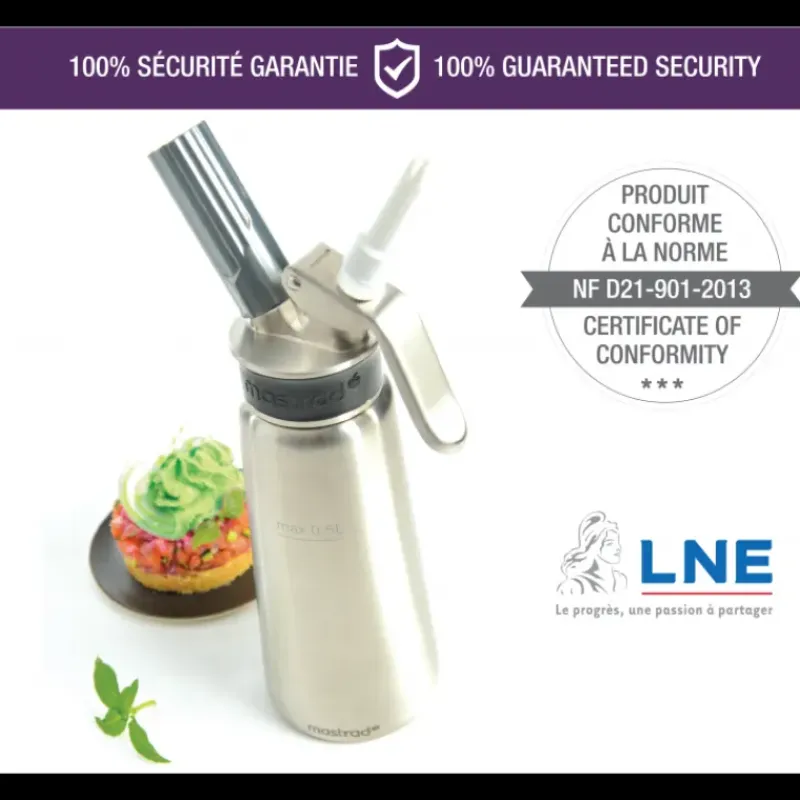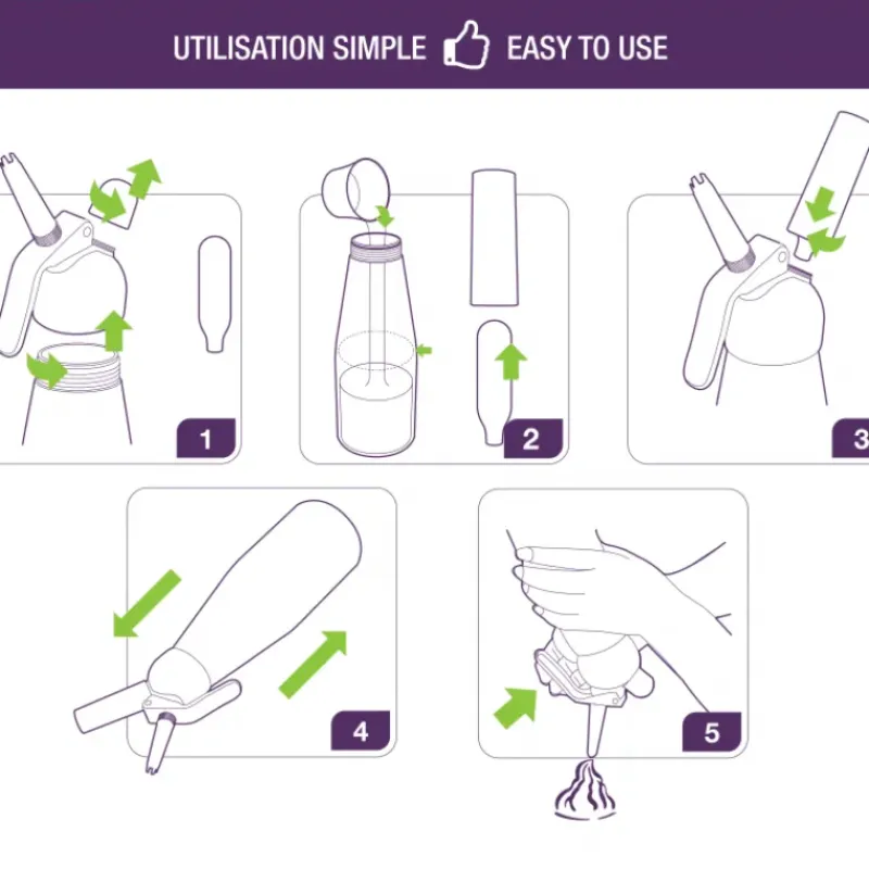 Conseil d’utilisation : versez la préparation préalablement filtrée dans la cuve en inox, fermez le siphon, insérez une cartouche de gaz puis placez le siphon au réfrigérateur ou au bain-marie (selon votre recette). C’est aussi simple que ça.