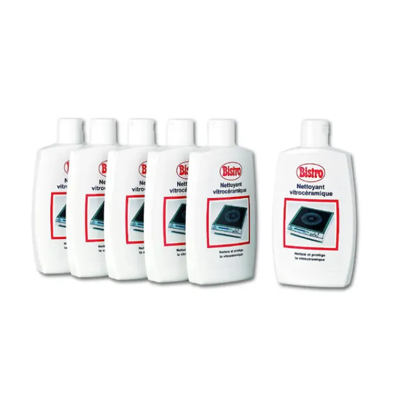 Produit d’entretien spécial Vitro céramique, nettoie et élimine les traces de résidus brûlés sur les plaques de cuisson (halogène, radiant, induction). Le nettoyant Bistro vitro céramique forme une pellicule invisible qui facilite l’entretien.