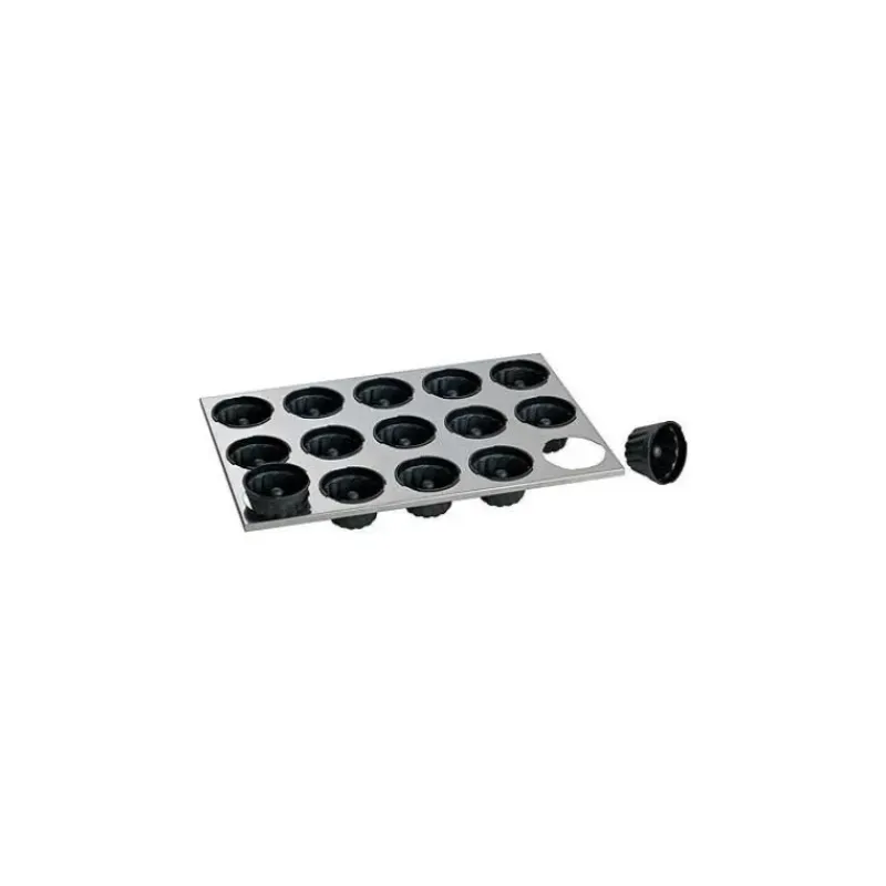 Plaque 15 moules à kouglof Exoglass® Ø 9,5 cm montés sur une plaque en acier inoxydable. Facilite la manipulation des moules lors du remplissage et de la cuisson. Moules amovible pour le lavage. Verrouillage sur plaque par vissage 1/4 de tour.