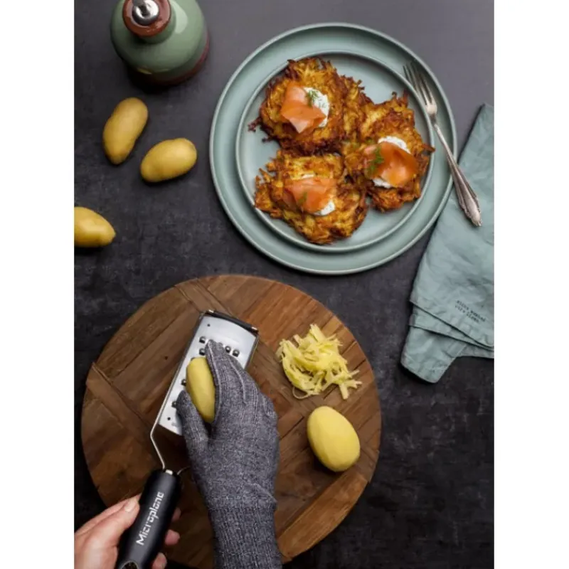 Fabriqué dans un tricot sans fil et sans coutures, ce gant de cuisine résiste aux coupures pour vous permettre de râper, trancher, couper vos aliments en toute confiance. Le gant de protection anti-coupure est spécialement conçu pour s’utiliser avec les produits Microplane, qui bénéficient de lames ultra-tranchantes. Il n’y a aucun risque de s’égratigner en les utilisant grâce à ce gant souple très résistant.