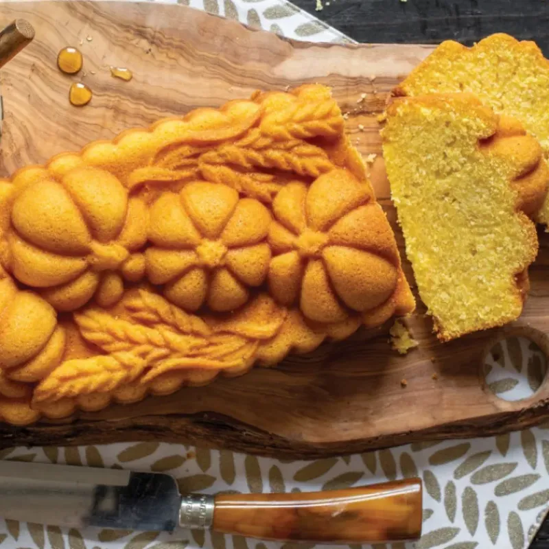 Récoltez une montagne de compliments sur vos desserts en confectionnant un cake à l’image d’une récolte automnale. Citrouilles généreuses et épis de blés sont entremêlés à la surface de ce moule à cake Nordic Ware.