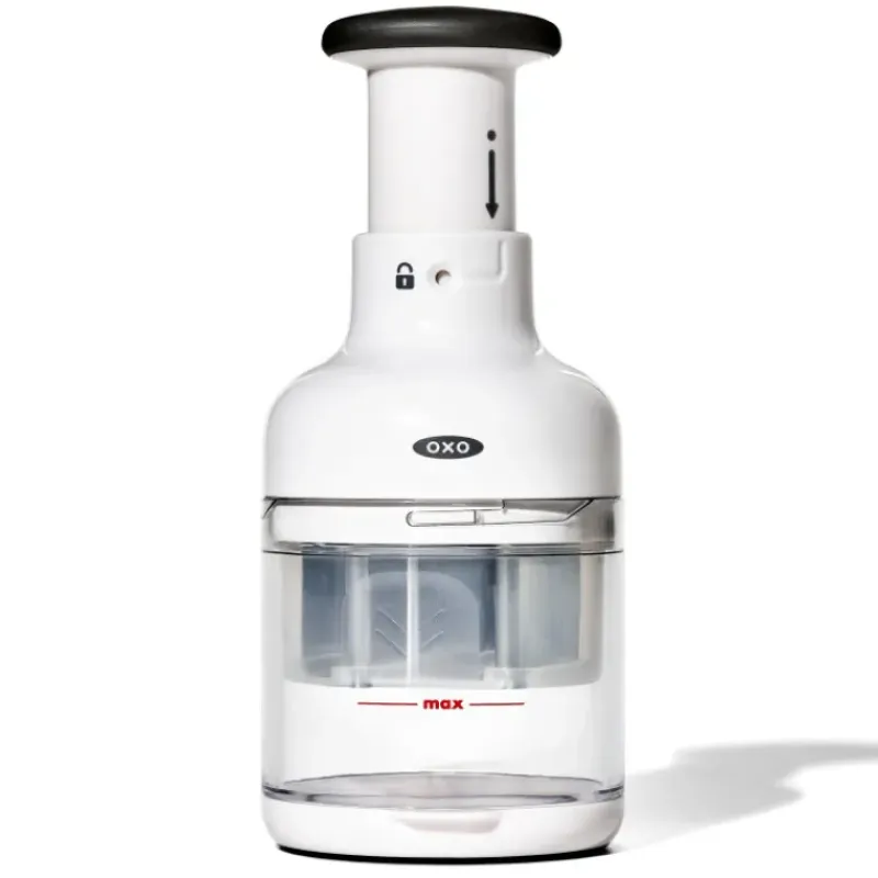 Muni d’un couvercle, vous pourrez conserver vos aliments au réfrigérateur directement dans le bol de votre hachoir à piston Oxo. Une simple pression sur votre hachoir manuel vous permettra de hacher vos herbes, fruits secs ou aromates.