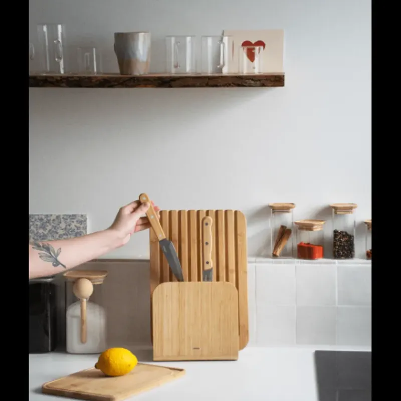 Les puissants aimants du support permettent de ranger les couteaux en toute sécurité. La planche à découper et la planche à pain sont fabriquées en bambou, un matériau écologique reconnu pour sa résistance et qui garantit la longévité des ustensiles. De même que pour les couteaux de chef et à pain dont le manche est en bambou et la lame en acier inoxydable. Le couteau de chef est idéal pour réaliser un grand nombre de tâches culinaires tandis que le couteau à pain possède une lame dentelée spécialement conçue pour couper le pain sans en déchirer la mie.