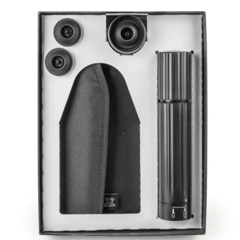 Offrez ce sublime Coffret Pompe à Vin et Champagne Double Manuelle ABS + Rafraichisseur Frizz Noir Peugeot.