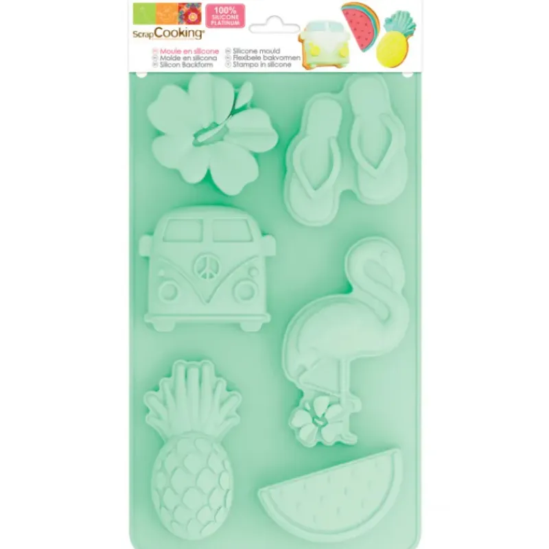 Summer is in the air ! Prenez un brin de soleil grâce au Moule Silicone Summer (x6) Scrapcooking ! Avec ses 6 formes différentes, ce moule à pâtisserie vous permettra de réaliser des biscuits ou sablés. L’été c’est la période rêvée pour se promener en tongs que ce soit à la plage ou dans son jardin, profiter de la piscine ou déguster des fruits bien juteux. Le moule silicone pâtisserie connaît vos attentes estivales et vous propose 6 motifs à utiliser lors de la confection de vos pâtisseries : une paire de tongs, une jolie fleur, une délicieuse pastèque, un gros ananas, un adorable flamant rose et un van familial.