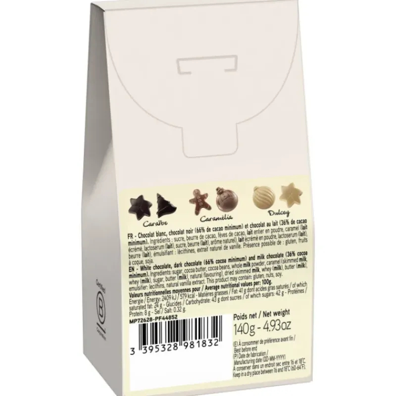 Parfait comme cadeau pour les fêtes de fin d’année, ce coffret chocolat abrite en lui 140 g de chocolat moulés dans des formes rappelant Noël. Vous pourrez ainsi apprécier les sapins de Noël, les bonhommes pain d’épices, les étoiles ou encore les boules de Noël.