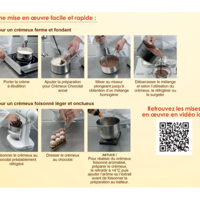 La préparation pâtisserie vous permettra d’ajouter une note de gourmandise à vos desserts de façon rapide et facile. Il vous suffit d’ajouter de la crème liquide 35% M.G. (1L de crème liquide pour 200g de crémeux chocolat) et vous obtenez de délicieuses quenelles chocolatées pour un dessert à l’assiette, un insert gourmand pour un entremets ou encore une savoureuse ganache pour vos macarons.