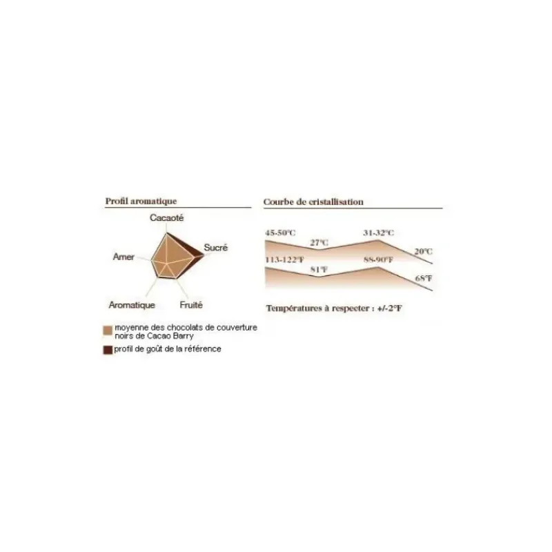Ce chocolat Noir saura vous séduire par son goût équilibré de cacao et sa belle rondeur en bouche notamment pour la réalisation de vos mousses et sauces.
