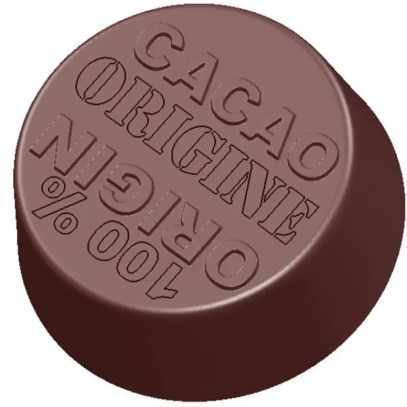 Vous pourrez réaliser des bonbons ronds en chocolat estampillés « 100% origin cacao ».