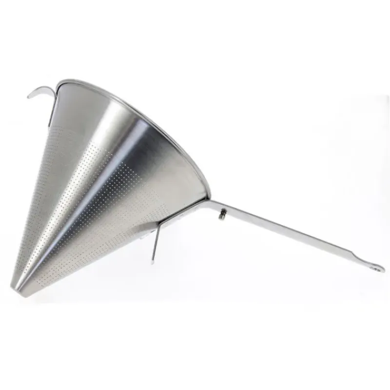 Ce chinois fabriqué en France est constitué d’acier inoxydable ce qui le rend robuste. Deux crochets et une queue en inox assure une maniabilité optimale, tandis que le trou d’accrochage facilite le rangement du chinois micro-perforé.