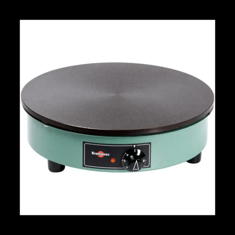 Cette crêpière Krampouz est une véritable crêpière professionnelle de qualité supérieure, ayant été adaptée pour un usage ménager ! La crêpière électrique Krampouz possède une plaque en fonte d’acier émaillée, certifiée contact alimentaire, de 40 cm de diamètre.