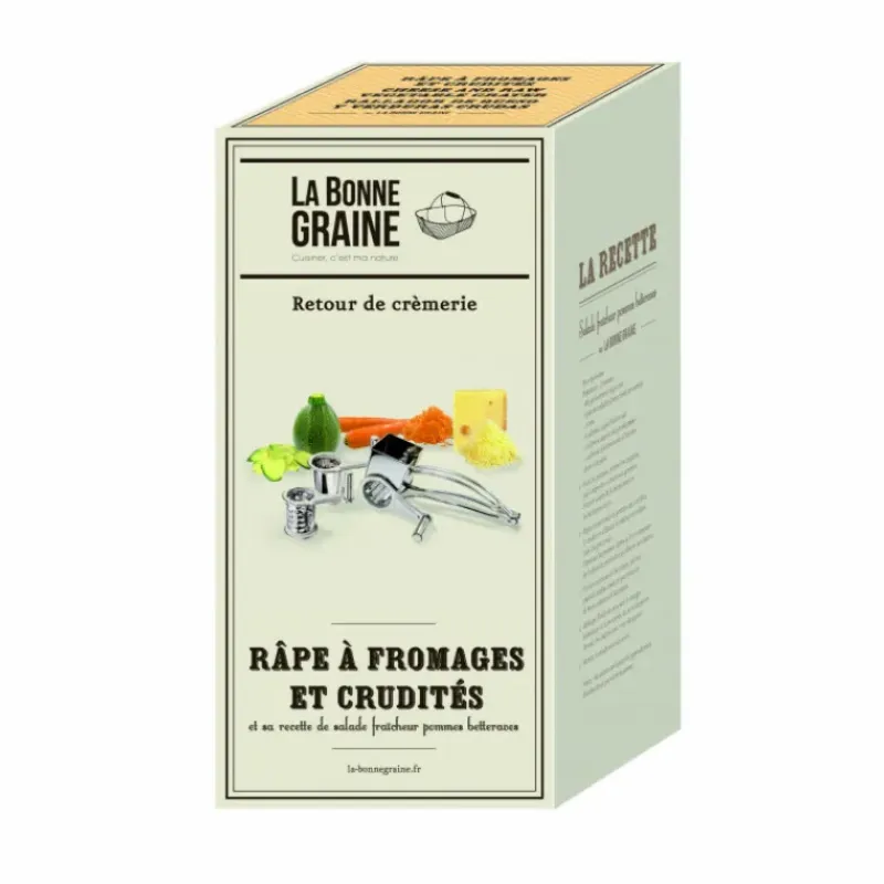 Inox et ambidextre. muni de 3 tambours : un tambour gruyère pour râper les fromages à pâte dure, un tambour crudité pour les fruits et légumes (ou râper gros le parmesan) et un tambour rondelle pour obtenir de jolis copeaux ou lamelle de comté.