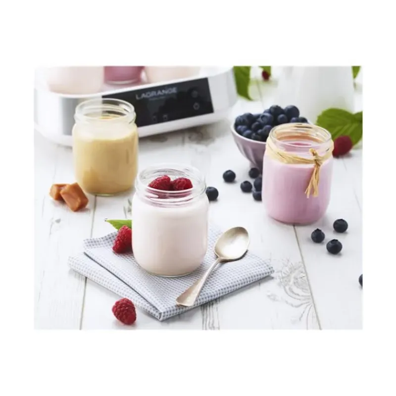 Réalisez vos laitages maison à l’aide de la Yaourtière Lagrange. D’une puissance de 16 watts, elle vous permettra de réaliser 9 yaourts en une fois. La yaourtière Lagrange s’accompagne de 9 pots en verre dont le volume est de 185 g. Afin de remplir tous les pots, il vous faudra 1.5 L du lait de votre choix. Grâce à l’écran tactile, la programmation devient très intuitive. Afin de gagner du temps, la yaourtière 9 pots Lagrange vous propose une programmation jusqu’à 15h00.