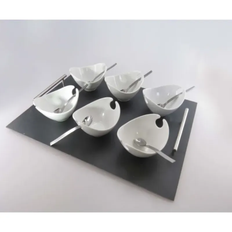 Ce plateau avec ses 6 coupelles Jonque blanches vous est proposé par LeBrun. Le coffret se compose également de ses 6 cuillères mixtes (cuillère et fourchette), présenté sur un plateau en ardoise avec ses poignées métalliques.
