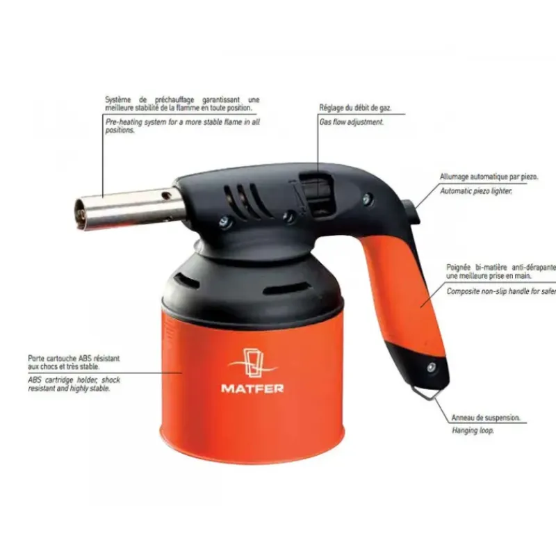 Le chalumeau à gaz Matfer de qualité professionnelle est recommandé pour la caramélisation des crèmes brûlées et des entremets, le collage de pièces en sucre et le brûlage des volailles. Le chalumeau à gaz Matfer dispose de plusieurs avantages, le porte cartouche est résistant aux chocs, l’allumage est automatique par piezo, le débit de gaz peut être réglé via une molette et il y a un système de préchauffage garantissant une meilleur stabilité de la flamme en toute position.