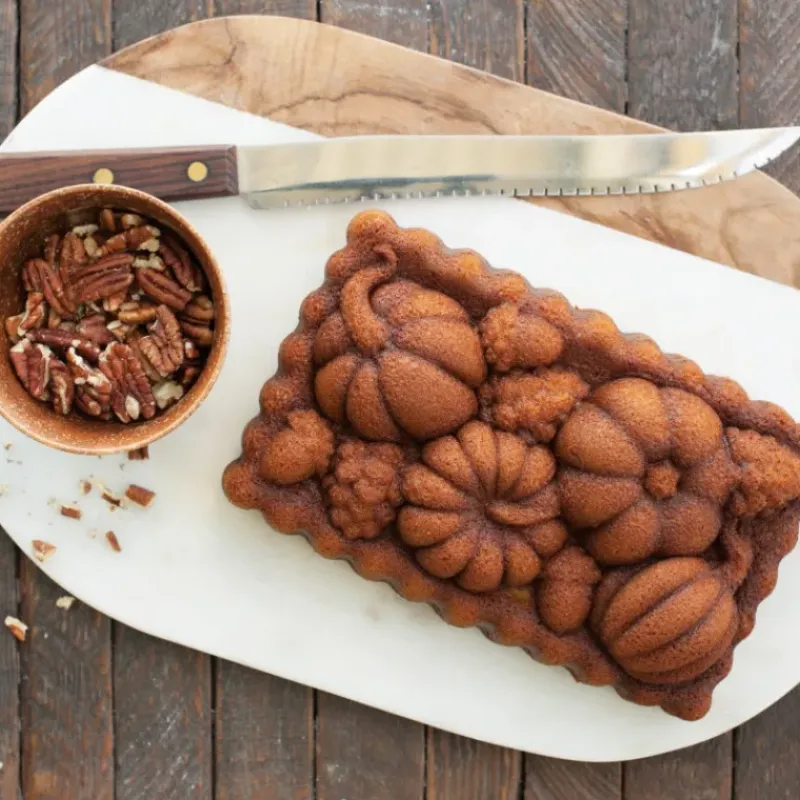 Représentant le fruit d’une récolte automnale, ce moule pour cake Nordic Ware mêle les formes rondes des citrouilles à des grappes de raisin et des glands. Cette combinaison délicieuse est figée dans de la fonte d’aluminium : ce matériau durable et robuste est habillé d’une belle couleur bronze qui décorera votre cuisine avec élégance. Pour toutes les occasions, le moule à cake citrouille donnera vie à vos idées sucrées.