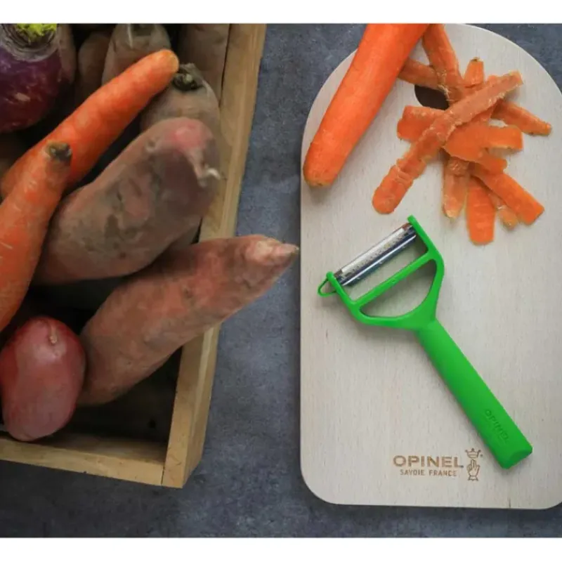 Composé de deux lames en inox dont une micro dentée, cet ustensile permet non seulement d’éplucher les aliments, mais aussi de les couper façon julienne. Vous trouverez également un embout sur le côté de l’éplucheur Opinel pour énucléer les pommes de terre sans effort.