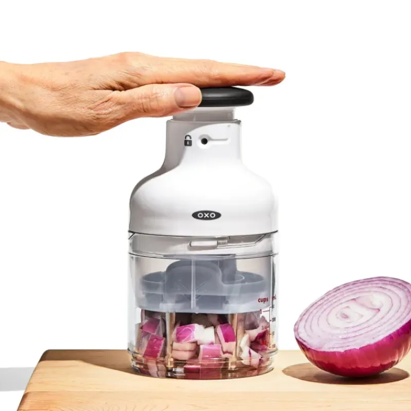 Le Hachoir Oxo est très pratique pour hacher les oignons, les échalotes, les herbes, les noix etc. Grâce à son récipient gradué, il vous sera facile de mesurer les quantités d’aliments.