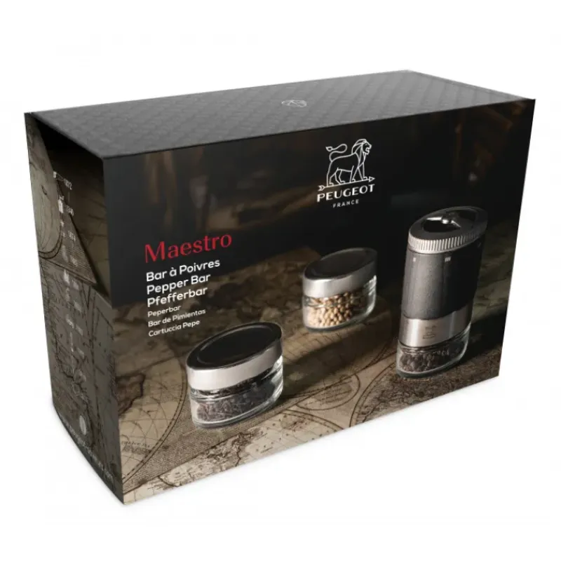 Profitez de toute l’expertise de Peugeot grâce à ce coffret aussi appelé Bar à poivre Maestro avec Moulin, Réservoirs et 3 poivres Peugeot.