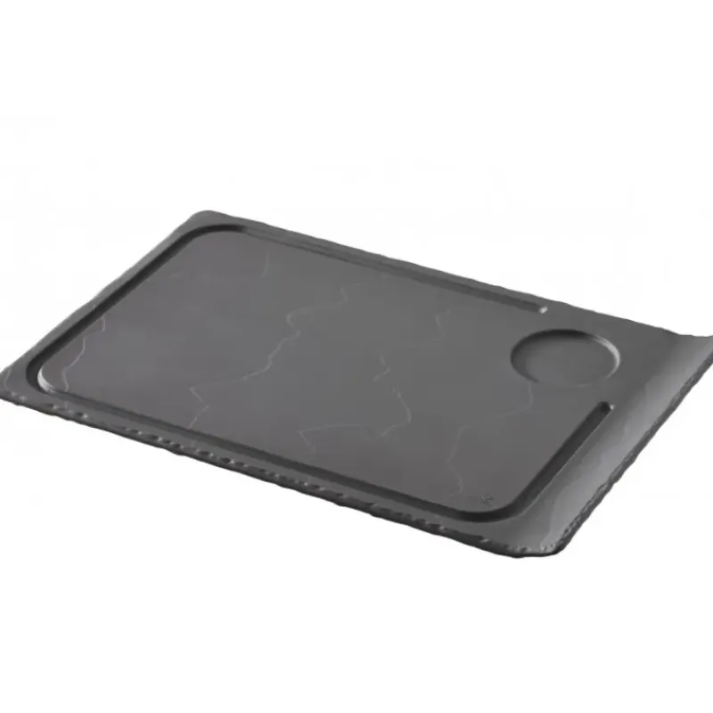 Cette assiette imite parfaitement l’ardoise, les finitions sont effectuées à la main pour vous proposer un article tendu vers la perfection qui vous satisfera dans toutes les situations. Munie d’une rigole, les sauces et les jus ne débordent pas. L’encoche de 5,5 cm de diamètre permet de déposer un gobelet Froissé Revol ou autre récipient garni de sauces, jus, frites et salades.