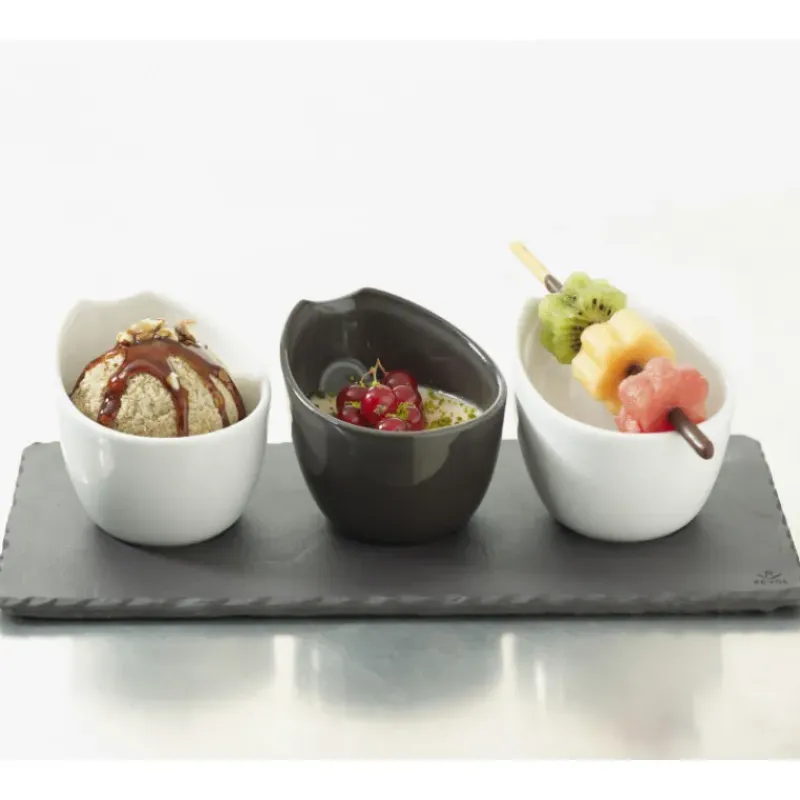 Servez une délicieuse trilogie des desserts avec le plateau rectangulaire Basalt en porcelaine Revol. Muni de 3 encoches de 4 cm de diamètre, vous pourrez disposez des gobelets Froissés Revol 8cl garnis de sauces, mignardises, muffins et glaces.