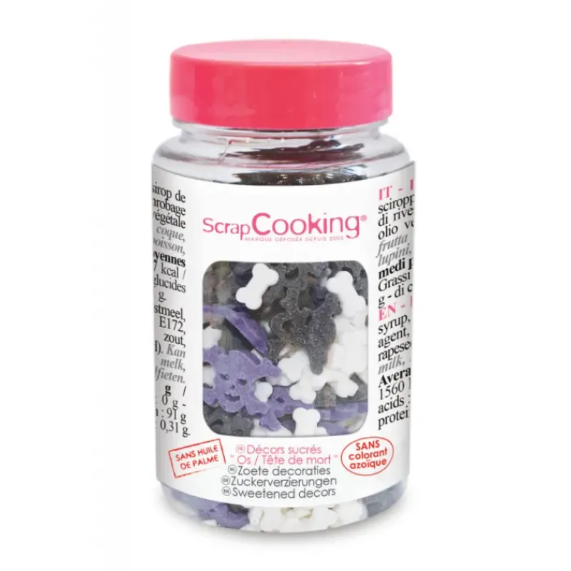 Préparer d’effroyables muffins, cupcakes ou biscuits pour votre soirée d’Halloween avec les têtes de mort et les os en sucre contenus dans le pot refermable. Les décors en sucre Halloween Scrapcooking, sans huile de palme, sauront terrifier les grands et les petits !