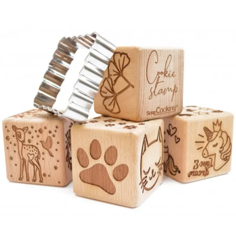 Pour ajouter de la féérie dans vos assiettes, le kit pâtisserie Scrapcooking propose un cube en bois dont 5 faces sont gravées avec différents motifs licornes comme des têtes de licornes, des arcs-en-ciel ou encore des silhouettes de licornes accompagnées de cœurs et d’étoiles. Associé à ce tampon biscuit, un emporte-pièce cannelé en acier inoxydable permettra de découper uniformément les biscuits.