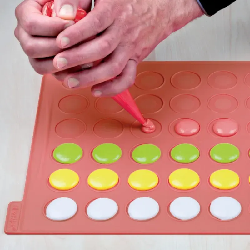 Plaque en silicone avec empreintes pour confectionner des macarons parfaitement réguliers.